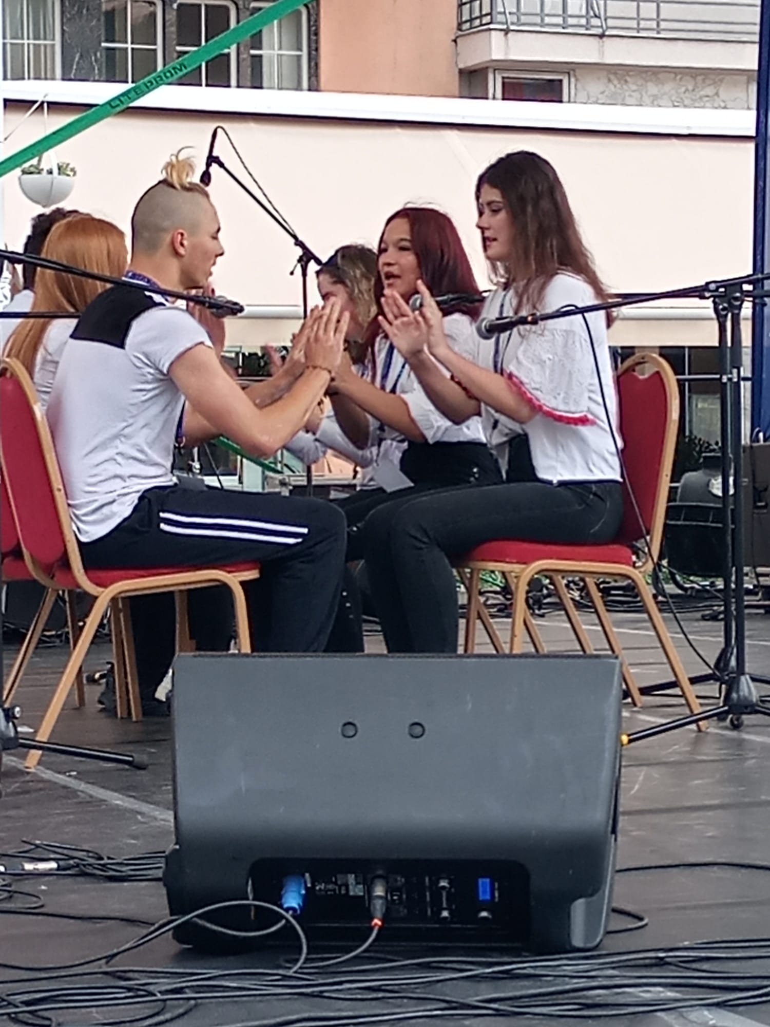 Na jučerašnjem festivalu sudjelovalo je veliki broj izvođača, a među njima bili smo i mi, „Vinko Bek“. Naš nastup bio je u 17:45. Laura, Štefica, Fatima, Maja, Eron i Marko su uz perkusije tijela ( to je generiranje zvuka vlastitim tijelom uz pomoć ruku, stopala, prstiju i usta) i u pratnji prof. Ružice i prof. Ivice otpjevali tri skladbe: Ja posijah repu, Kalendari i Falila se jagica.
