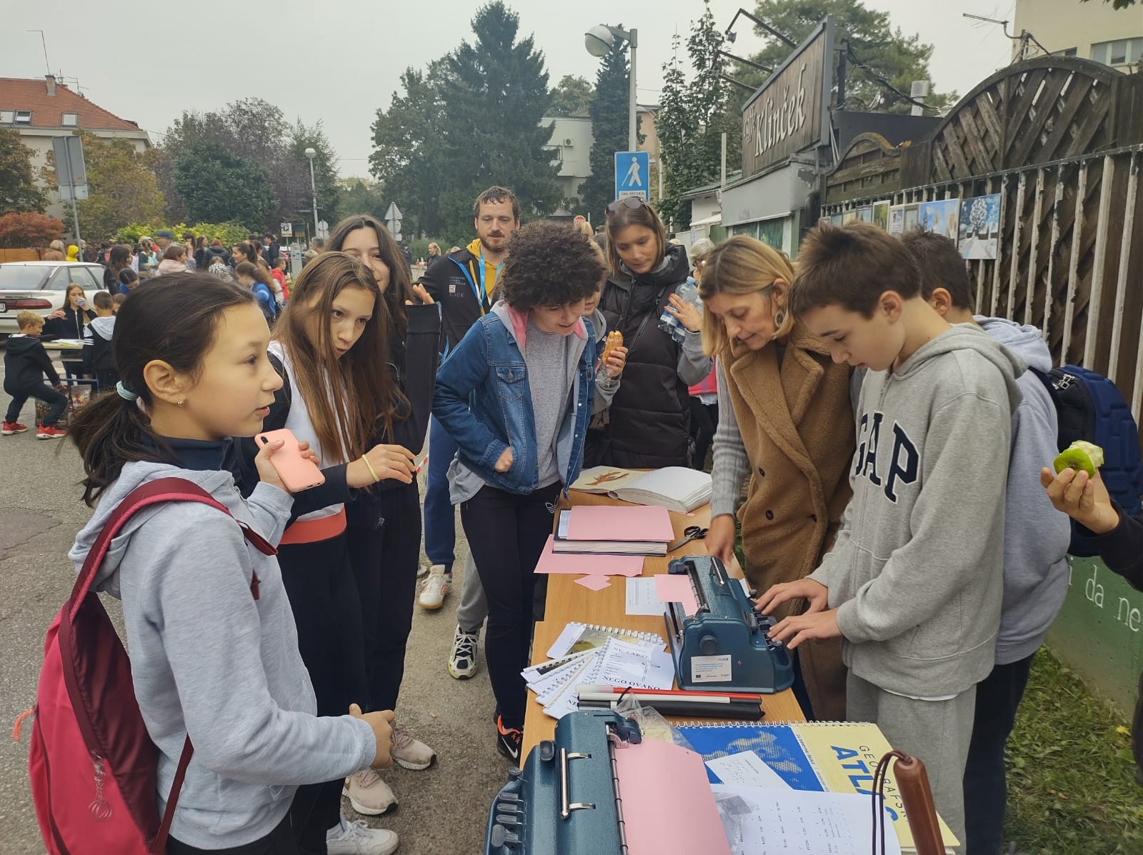 Da bismo članovima lokalne zajednice pokazali kako pomoći slijepoj osobi, dijelili smo brošure "Ne tako, nego ovako". Učenici osnovne škole iz susjedstva bili su zainteresirani za pisanje na brajičnom stroju, pa su dobili mogućnost upoznati se s Brajevim pismom. Pomoću "šalabahtera" pisali su svoje ime i prezime i imali priliku prevoditi Brajevo pismo na crni tisak.