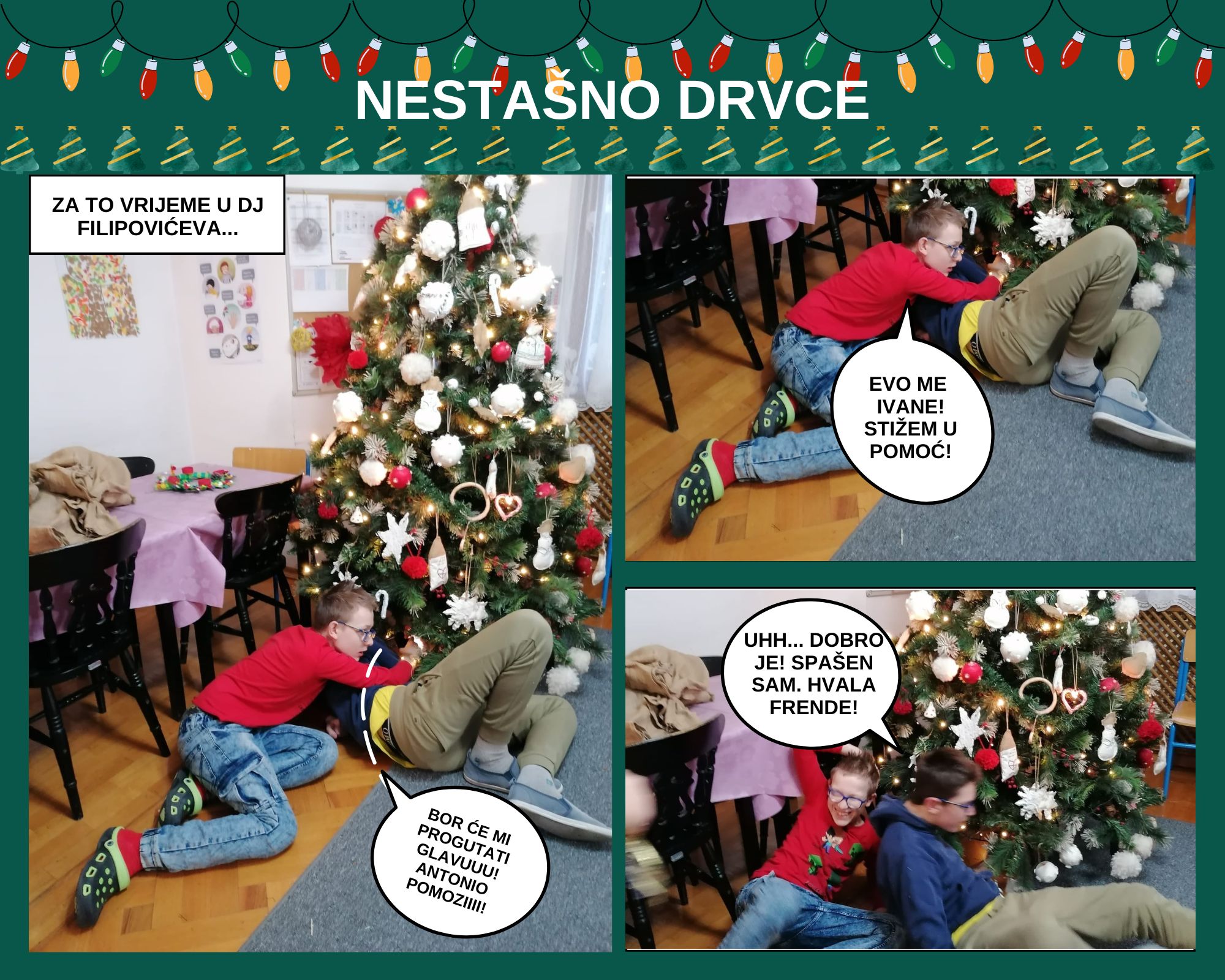 Sve je završilo sretno. To je radnja našeg malog šaljivog stripa te treba naglasiti da niti jedan učenik kao ni drvce nije stradao za vrijeme snimanja.